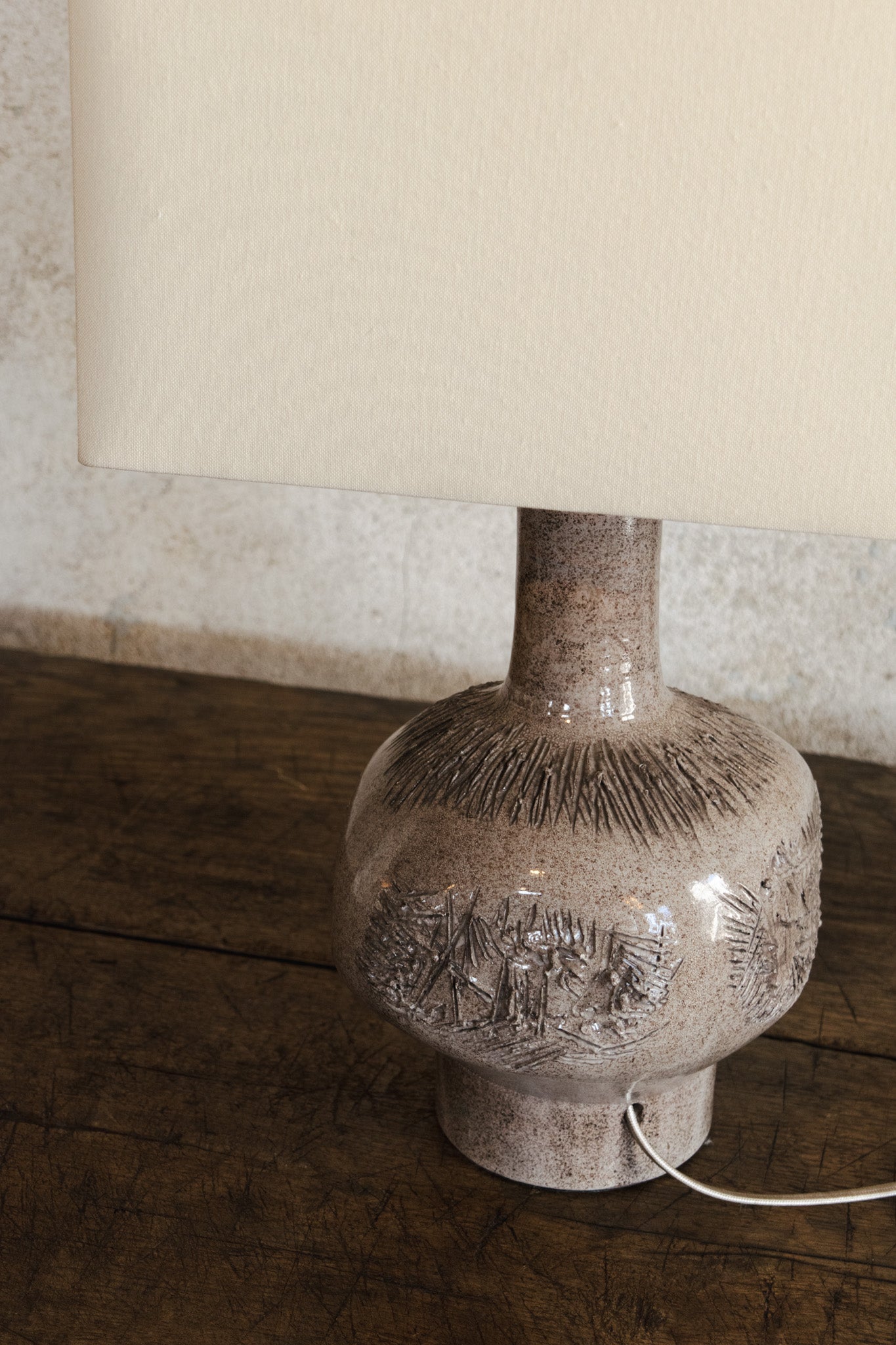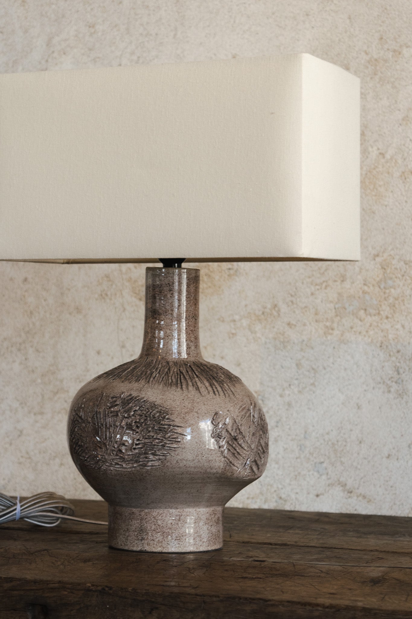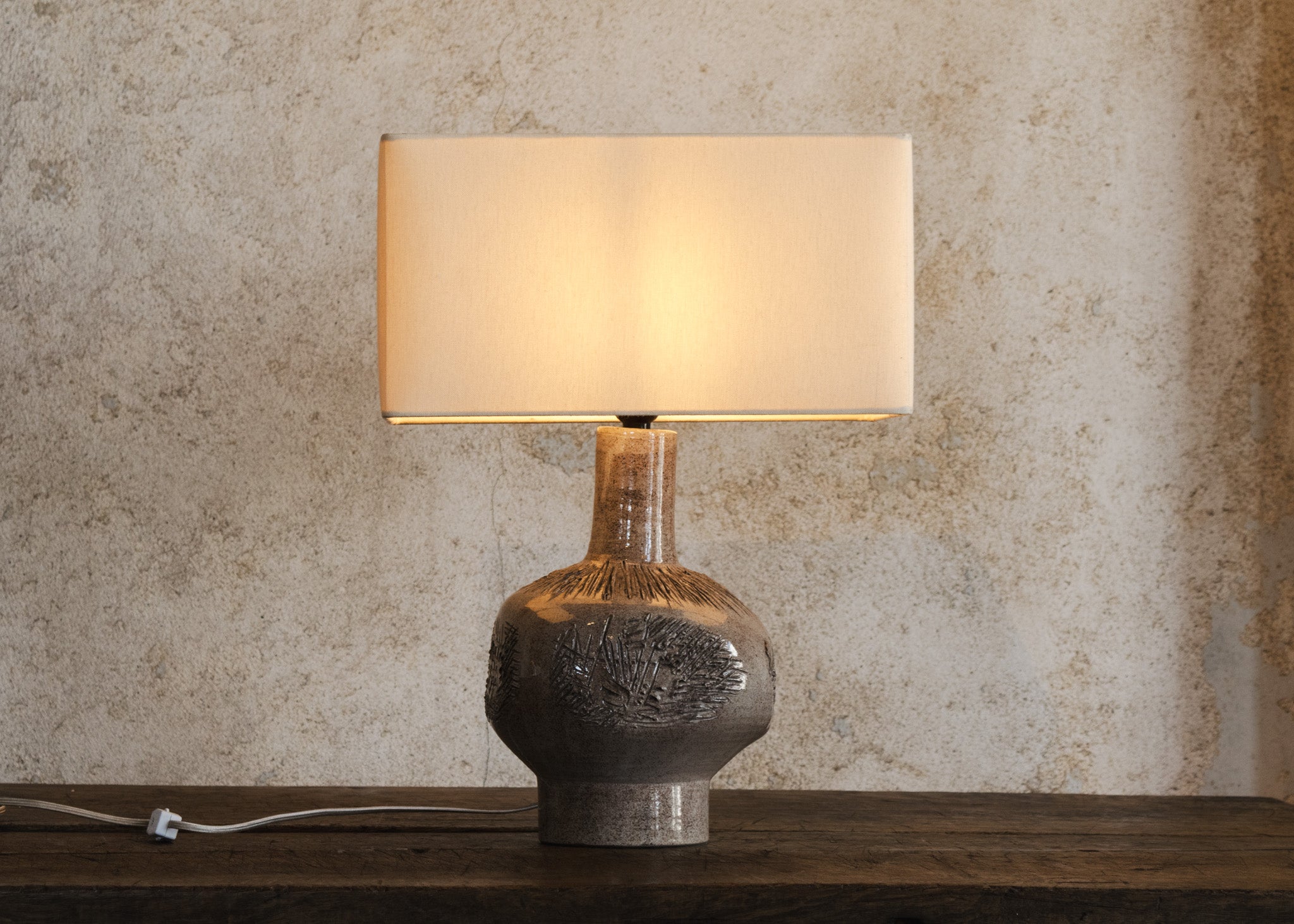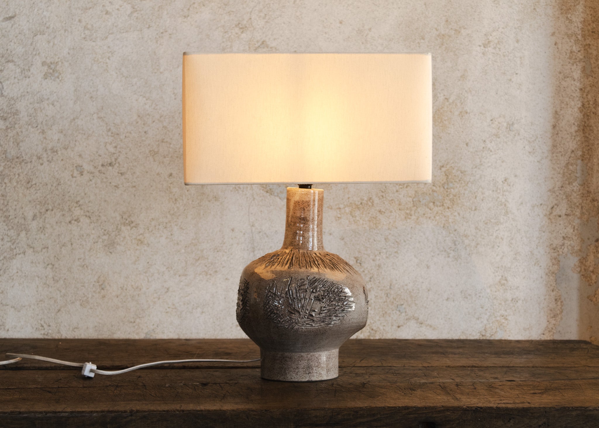 Ceramic | Linen shade | Rayon cord with thumb on/off switch