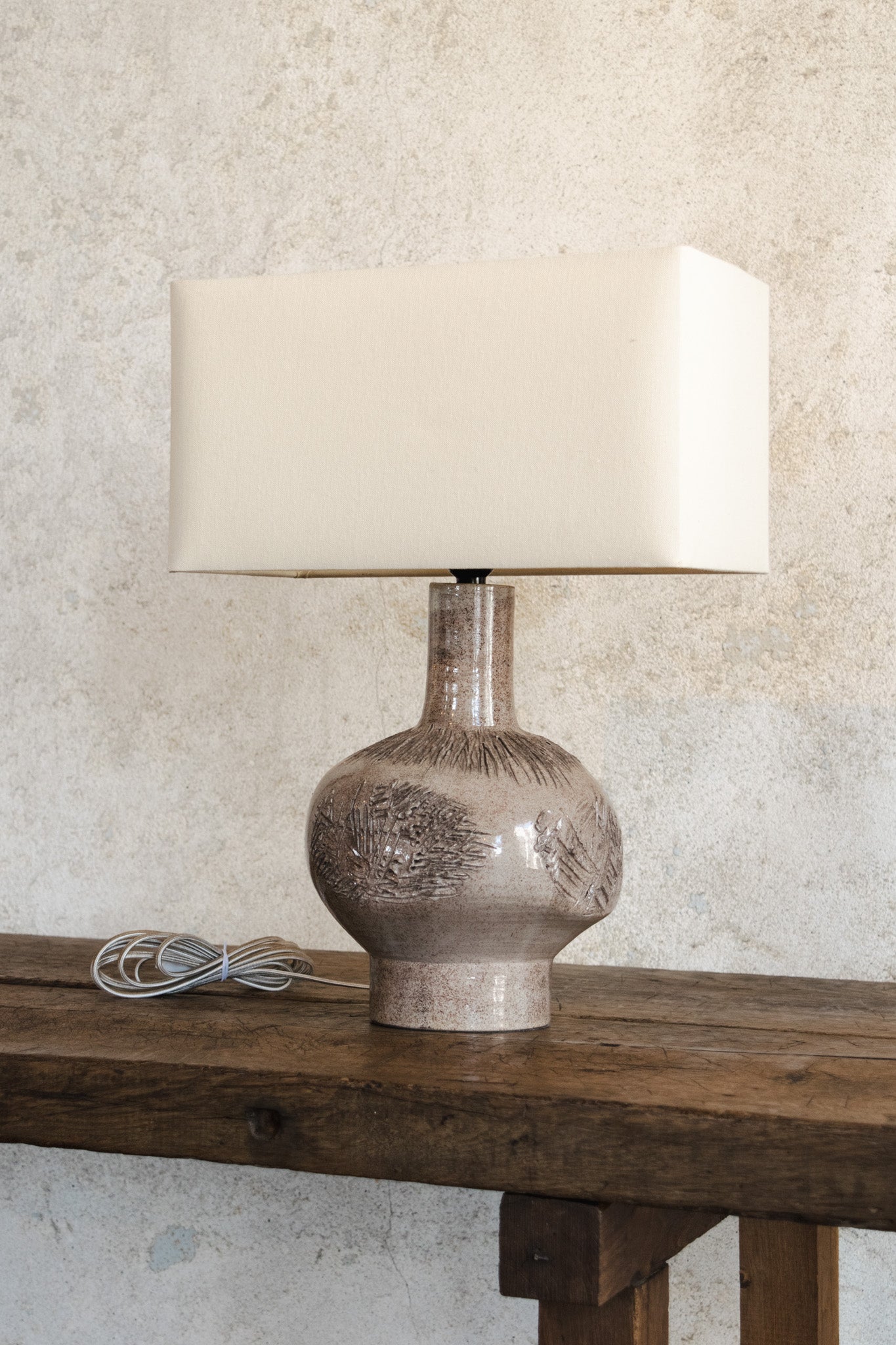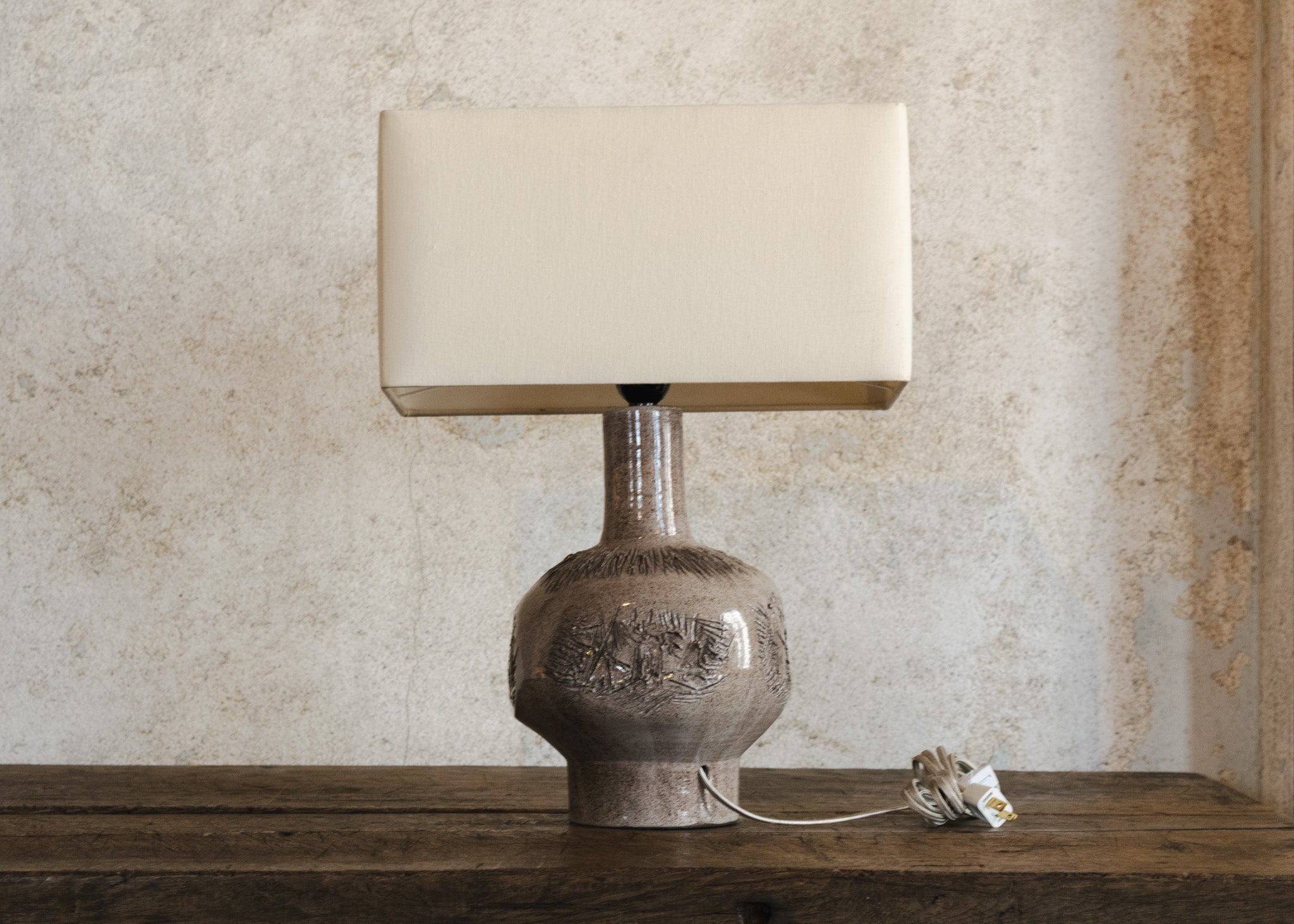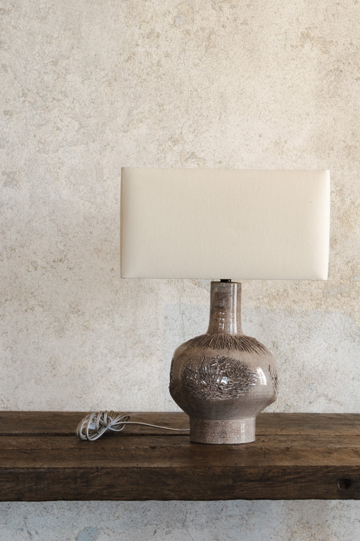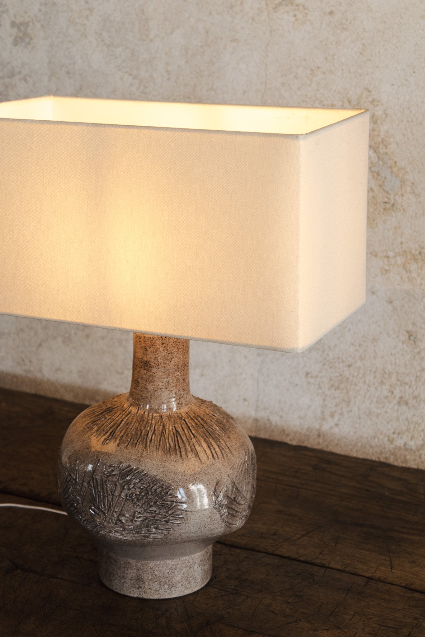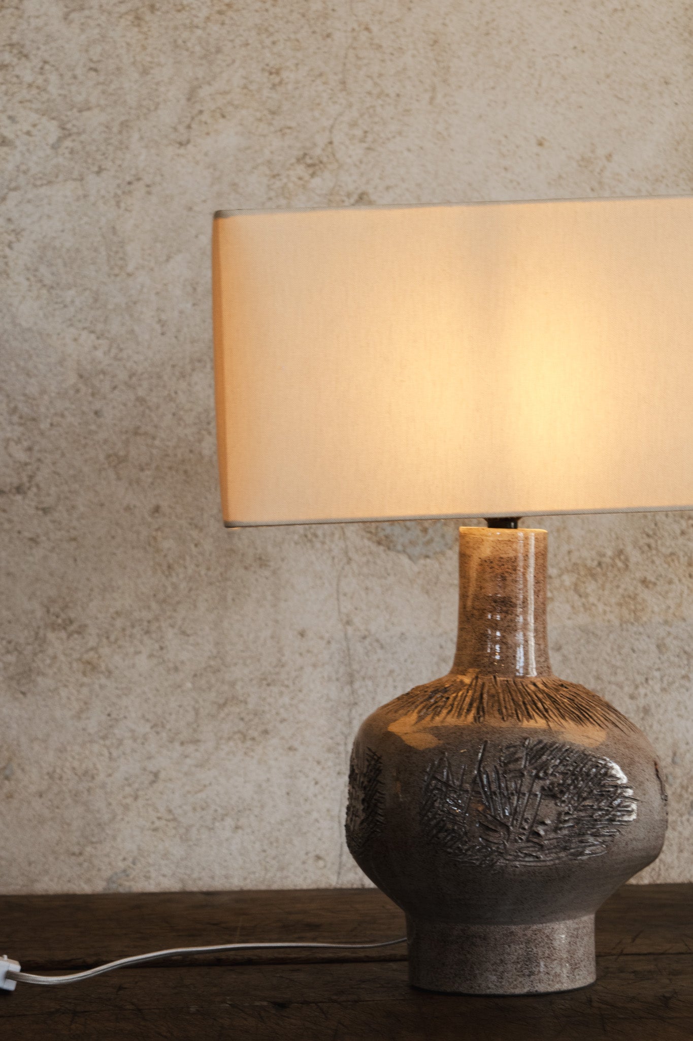 Ceramic | Linen shade | Rayon cord with thumb on/off switch