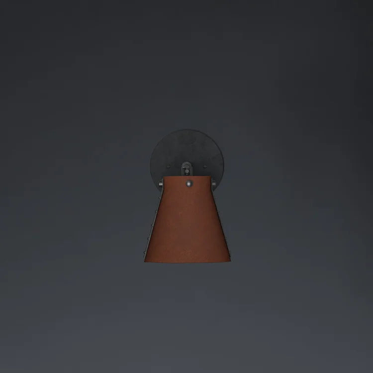 Leather or parchment shade with a brass canopy. Parchment should be considered a "living" material, and can change shape or shift during acclimatization or due to changes in heat or humidity once installed.