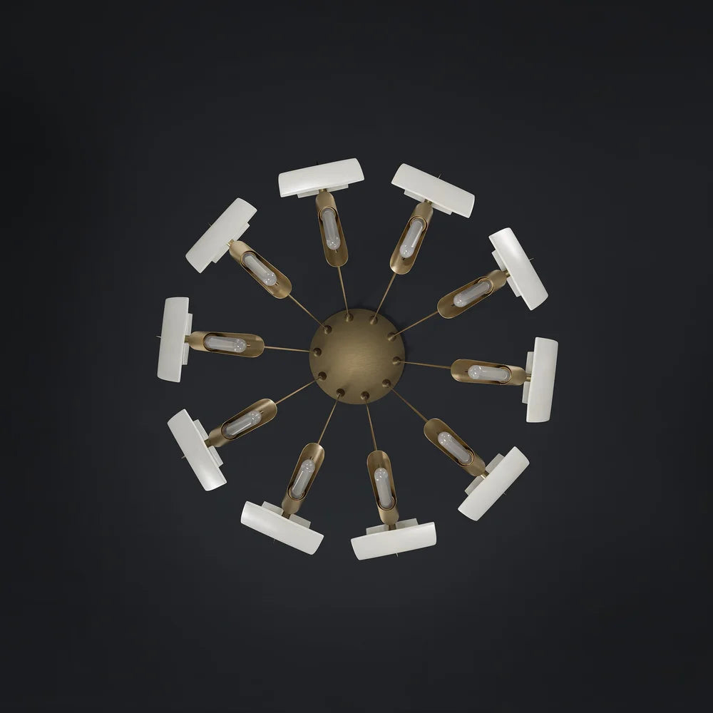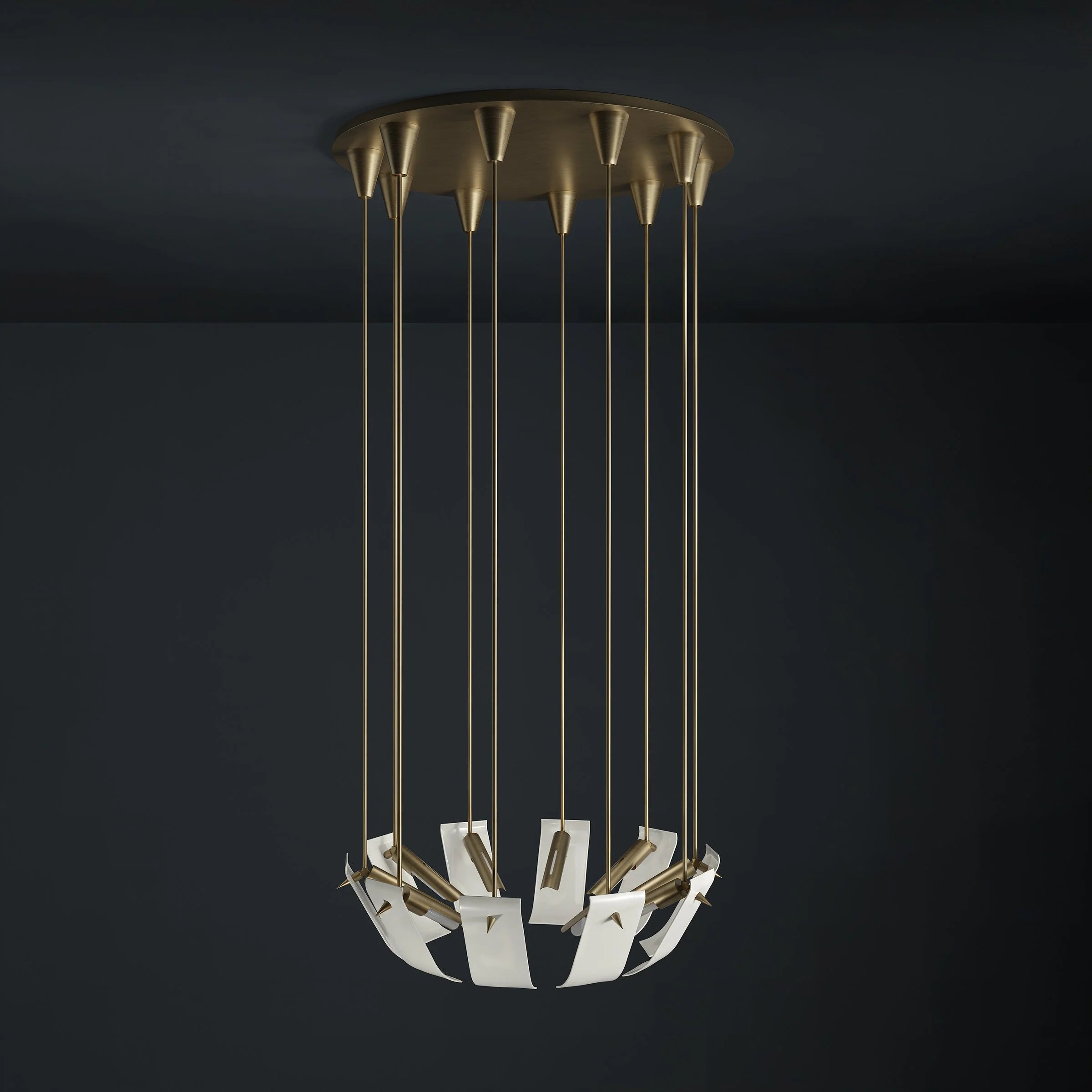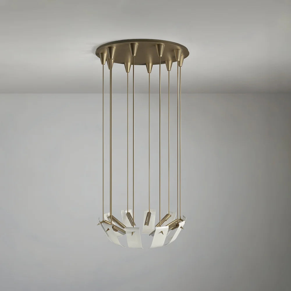 The Tsuru X Chandelier, inspired by the dancing silhouettes of the Red Crowned Crane, symmetrically balances organic shades of iridescent hand-fused glass or natural porcelain with spare spun brass shades. Light gently reflects against the glazed opaque porcelain faces, or glows of precious metals on the iridescent glass’ inner surfaces. When lit, the white glass pieces emanate a clear morning light, while the charcoal glass offers a glimpse into constellations of another universe. Fixture is made and finished to order in New England.